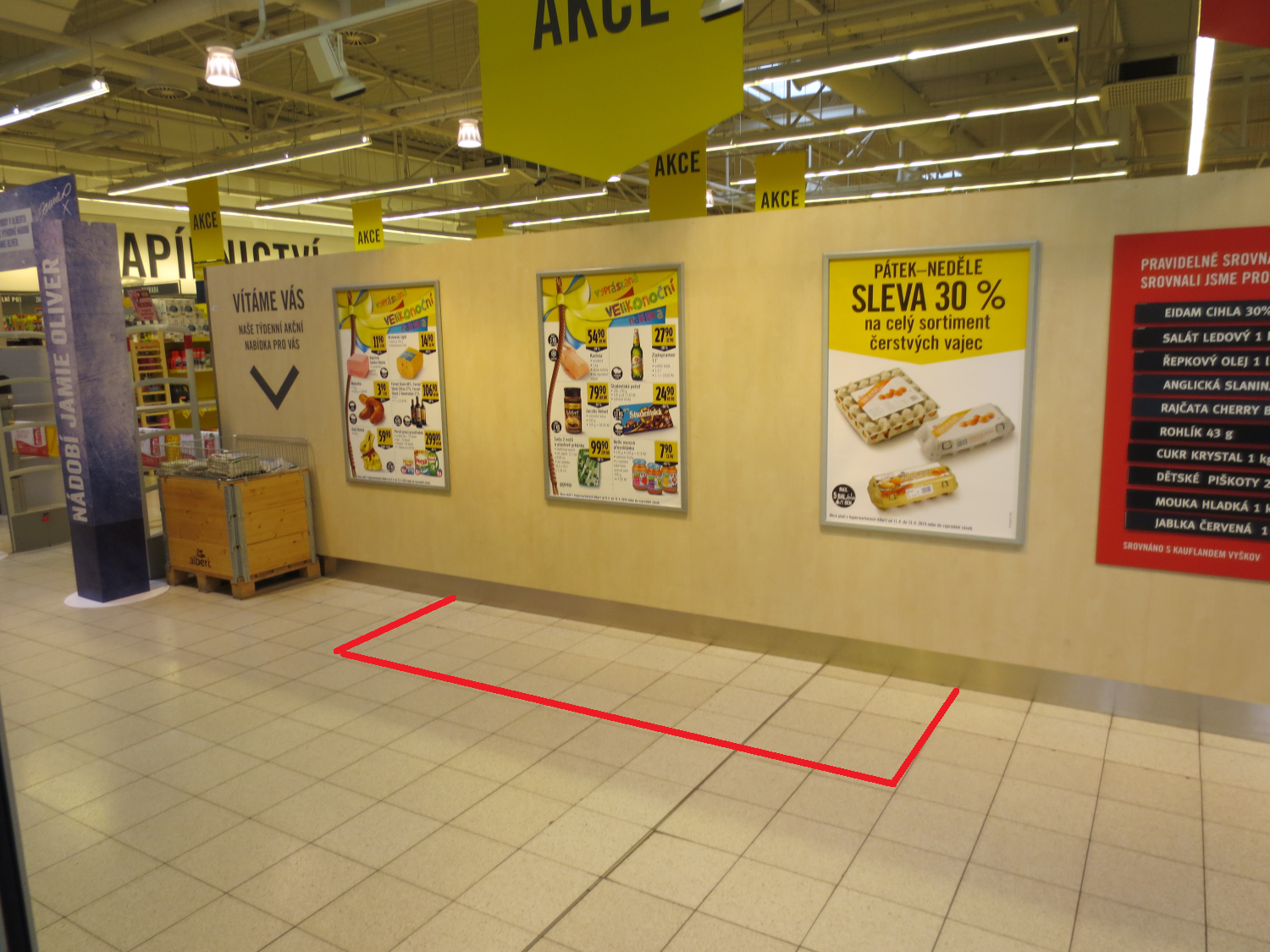 Prodejní plocha při vstupu do prodejny Albert. Vhodná pouze pro stánky do 1m hloubky.