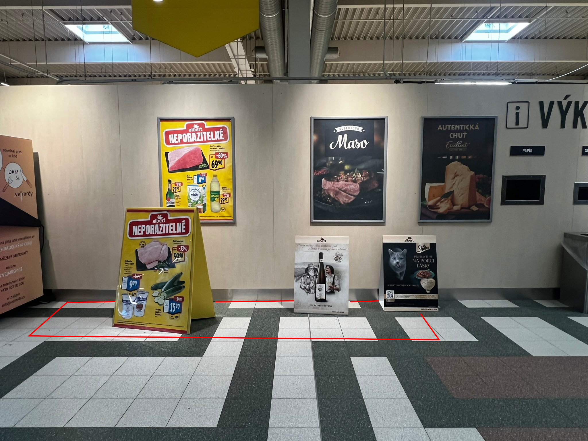 Obchodní plocha při vstupu do prodejny Albert. Je určena pro stánky s maximální hloubkou 1m.